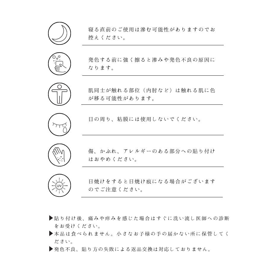 貼り付け後24時間~48時間程度で発色し、肌の代謝により10日程度でだんだんと消えていきます。